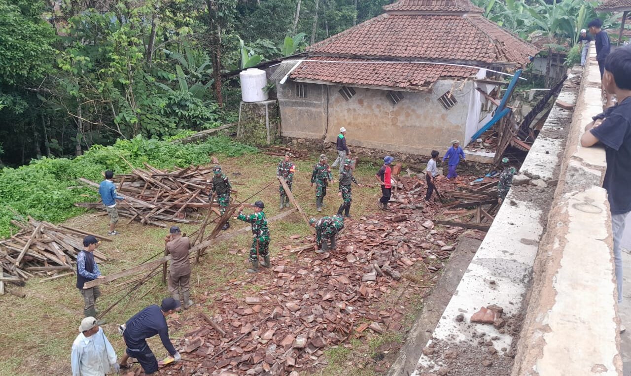 Pasca gempa Sumedang, TNI bersama masyarakat bergotong royong membersihkan puing-puing bangunan pasca gempa bumi di Dusun Tegal Panjang RT 02/01, Desa Cikoneng, Kecamatan Ganeas, Kabupaten Sumedang dan melaksanakan kegiatan karya bakti pembersihan material puing-puing bangunan Pasar Pemda, Desa Cikaramas.