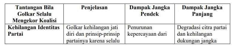 Jika Golkar terus menerus mengekor koalisi besar, partai ini akan menghadapi berbagai tantangan serius yang dapat mengancam eksistensinya. Salah satu tantangan utama adalah kehilangan identitas partai. Golkar bisa kehilangan jati diri dan prinsip-prinsipnya karena selalu mengikuti arahan dari koalisi besar.