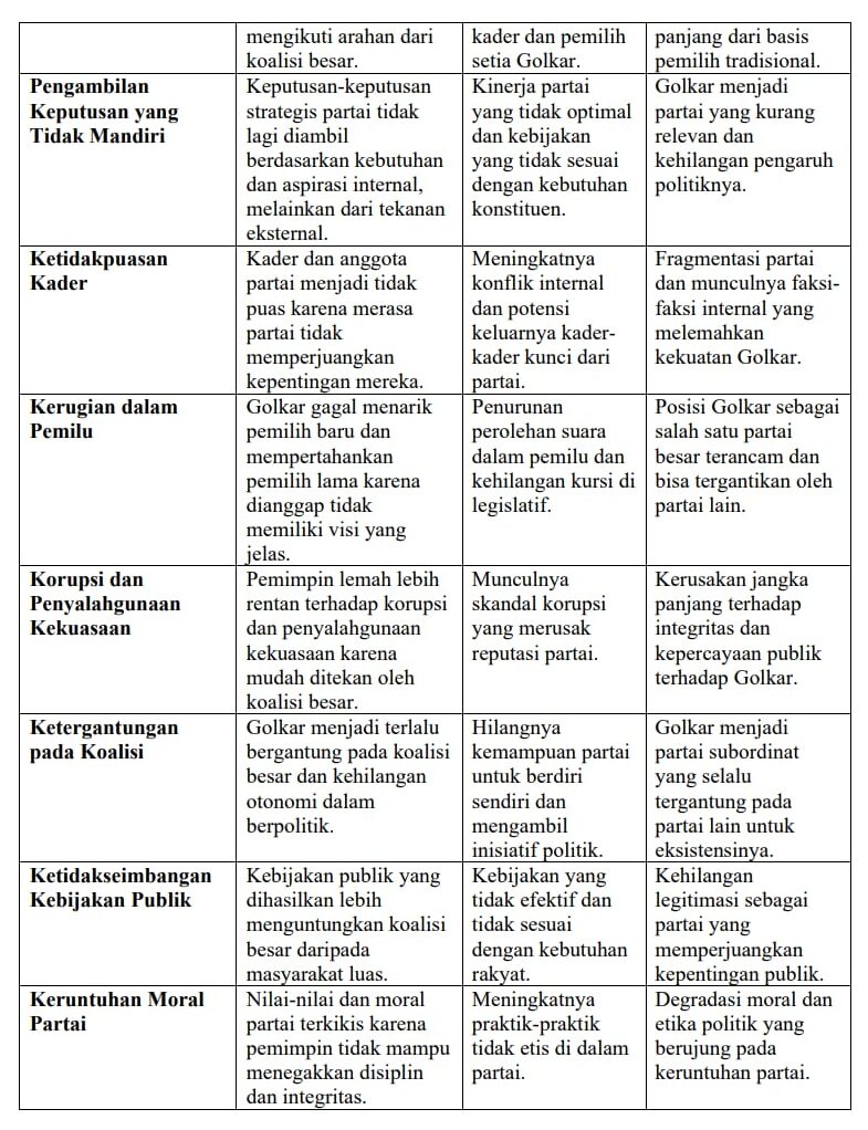 Pengambilan keputusan yang tidak mandiri juga menjadi masalah besar. Keputusan-keputusan strategis partai tidak lagi diambil berdasarkan kebutuhan dan aspirasi internal, melainkan dari tekanan eksternal. Akibatnya, kinerja partai menjadi tidak optimal dan kebijakan yang dihasilkan tidak sesuai dengan kebutuhan konstituen. Dalam jangka panjang, Golkar akan menjadi partai yang kurang relevan dan kehilangan pengaruh politiknya.
