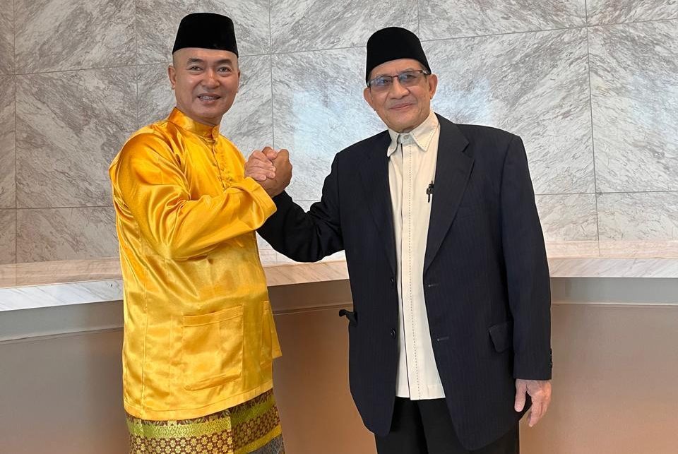 Ketua DPD MABM Kota Singkawang H. Asmadi, S.Pd.,M.Si bersama Ketua Persatuan Kebangsaan Melayu Sarawak DR Wan Ali Bin Mahdi. Pada Pesta Marhaban Borneo, di Kuching Sarawak Malaysia, 1-2 November 2025.